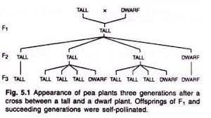 For instance, the genes of the hybrid alleles split during self-pollination among the offspring derived in the first filial generation, resulting in the production of tall and dwarf plants in the next generation. Tall plants to dwarf plants have a 3:1 ratio.